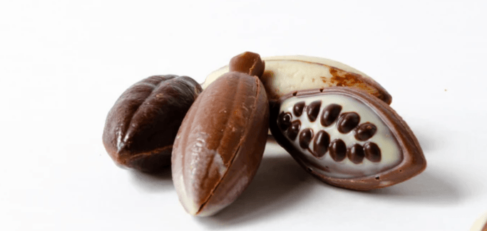 Votre douceur du jour : la cabosse ganache cajou avec morceaux de grué torréfié, fleur de sel et piment léger (sur la fin)